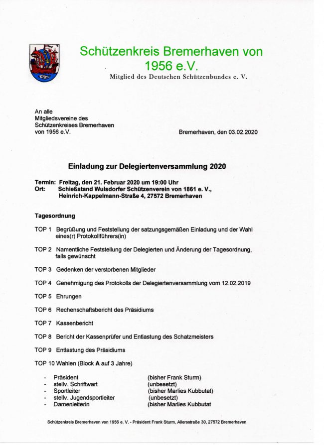 An alle Mitgliedsvereine des Schützenkreises Bremerhaven von 1956 e.V. anbei die Einladung sowie die Delegiertenmeldung zum download. Delegiertenversammlung 21.02.2020 Einladung Delegiertenversammlung 21.02.2020 Delegiertenmeldung Mitglieder Sk-Brhv Meldung 2019 NZ vom 28_02_2020