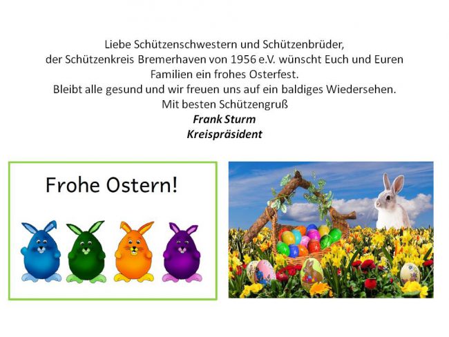 Liebe Schützenschwestern und Schützenbrüder,der Schützenkreis Bremerhaven von 1956 e.V. wünscht Euch und Euren Familien ein frohes Osterfest.Bleibt alle gesund und wir freuen uns auf ein baldiges Wiedersehen.Mit besten SchützengrußFrank SturmKreispräsident…