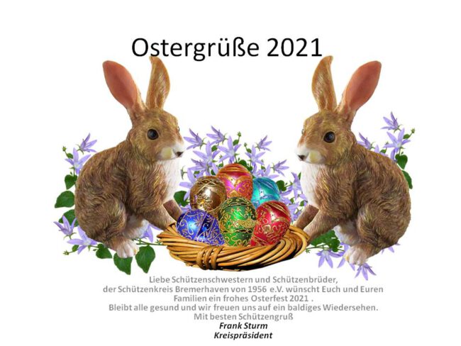 Liebe Schützenschwestern und Schützenbrüder,der Schützenkreis Bremerhaven von 1956 e.V. wünscht Euch und Euren Familien ein frohes Osterfest 2021.Bleibt alle gesund und wir freuen uns auf ein baldiges Wiedersehen.Mit besten SchützengrußFrank…