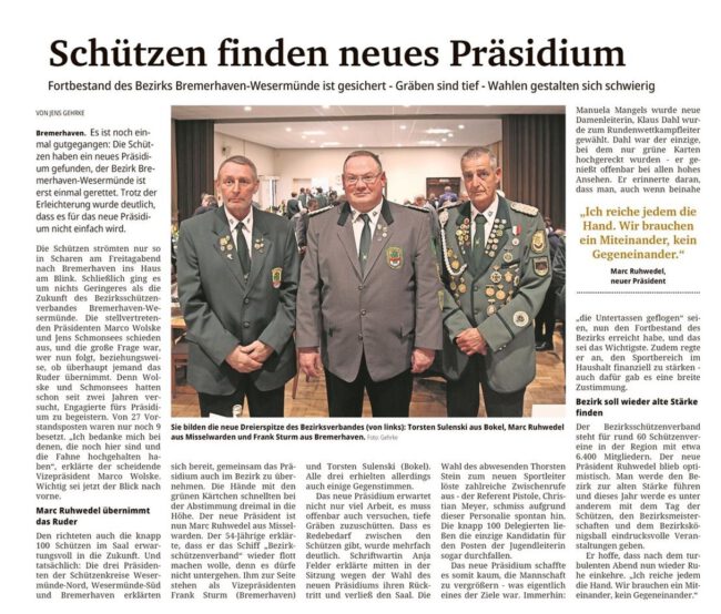 Schützen finden neues PräsidiumFortbestand des Bezirks Bremerhaven-Wesermünde ist gesichert- Gräben sind tief – Wahlen gestalten sich schwierigEs ist noch einmal gutgegangen: Die Schützen haben ein neues Präsidium gefunden, der Bezirk…